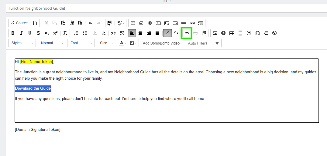 - Add or edit content to your email, then add a word, phrase, or image you'd like recipients to click on to access the file